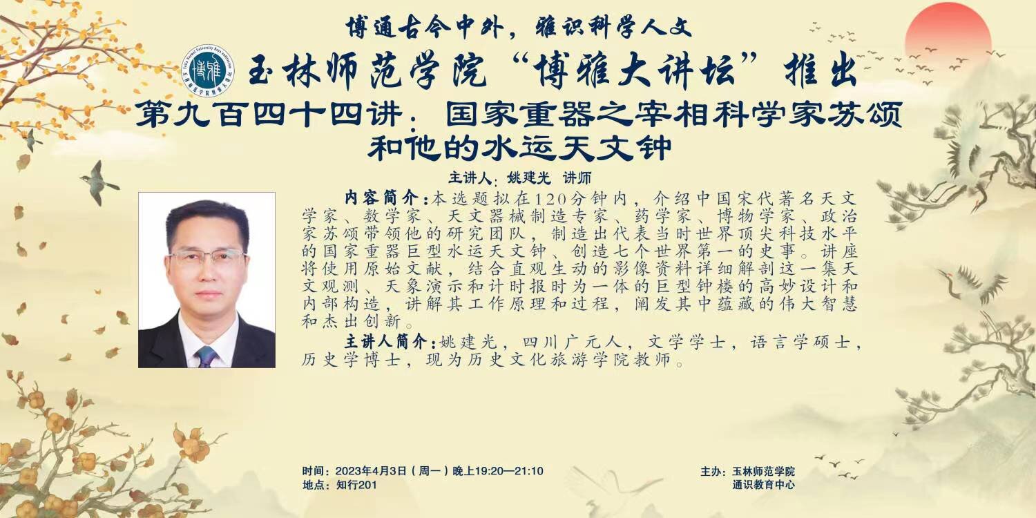 内容简介:本选题拟在120分钟内,介绍中国宋代著名天文学家、数学家、天文器械制造专家、药学家、博物学家、政治家苏颂带领他的研究团队,制造出代表当时世界顶尖科技水平的国家重器巨型水运天文钟、创造七个世界第一的史事。讲座将使用原始文献,结合直观生动的影像资料详细解剖这一集天文观测、天象演示和计时报时为一体的巨型钟楼的高妙设计和内部构造,讲解其工作原理和过程,阐发其中蕴藏的伟大智慧和杰出创新。