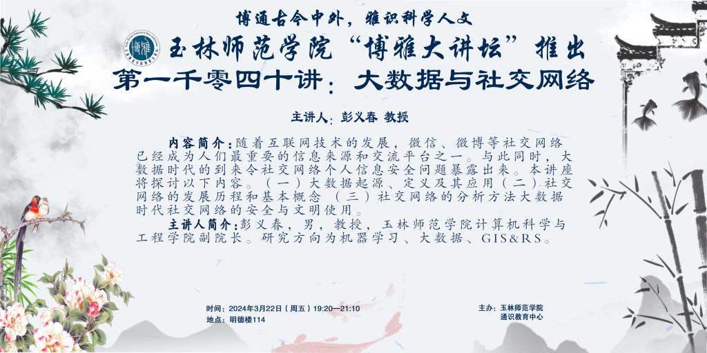 内容简介:随着互联网技术的发展,微信、微博等社交网络已经成为人们最重要的信息来源和交流平台之一。与此同时,大数据时代的到来令社交网络个人信息安全问题暴露出来。本讲座将探讨以下内容。(一)大数据起源、定义及其应用 (二)社交网络的发展历程和基本概念 (三)社交网络的分析方法 (四)大数据时代社交网络的安全与文明使用。