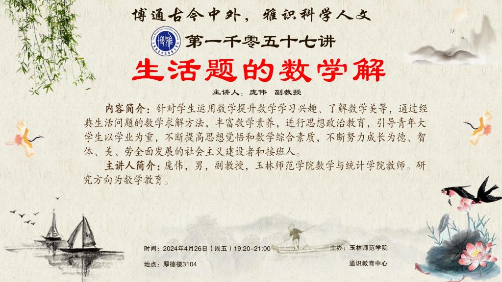 内容简介:针对学生运用数学提升数学学习兴趣、了解数学美等,通过经典生活问题的数学求解方法,丰富数学素养,进行思想政治教育,引导青年大学生以学业为重,不断提高思想觉悟和数学综合素质,不断努力成长为德、智、体、美、劳全面发展的社会主义建设者和接班人。
