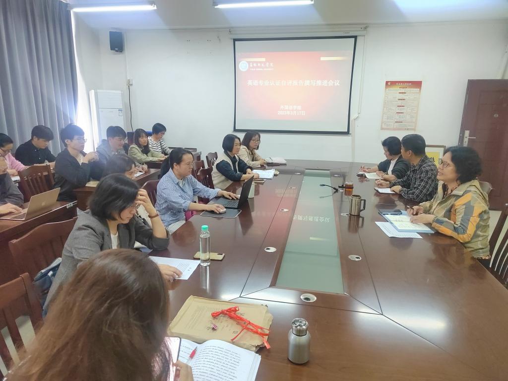 为进一步推进英语专业认证自评报告撰写工作,确保自评报告高标准、高质量完成,3月17日,外国语学院于我校东校区厚德楼1-306会议室召开英语专业自评报告撰写推进会议。该院党委书记梁国初,院长沈燕琼,副院长熊惠,英语专业认证工作小组参加此次会议。会议由沈燕琼主持。