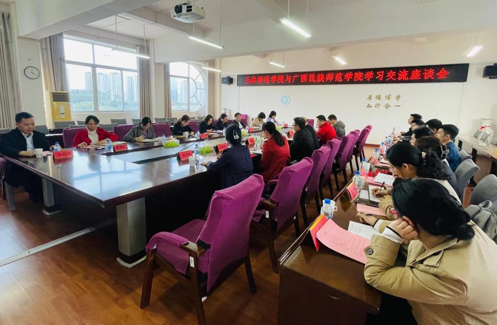 近日,广西民族师范学院教务处处长彭金云、副处长邓广彪、覃盛栋等一行到我校交流座谈。双方在我校东区第四会议室进行集中座谈,教师教育学院院长梁钊华,学生工作处副处长兼创新创业学院常务副院长李国庆,教务处副处长王易萍、邓旭及科级以上干部参加会议。会议由王易萍主持。
