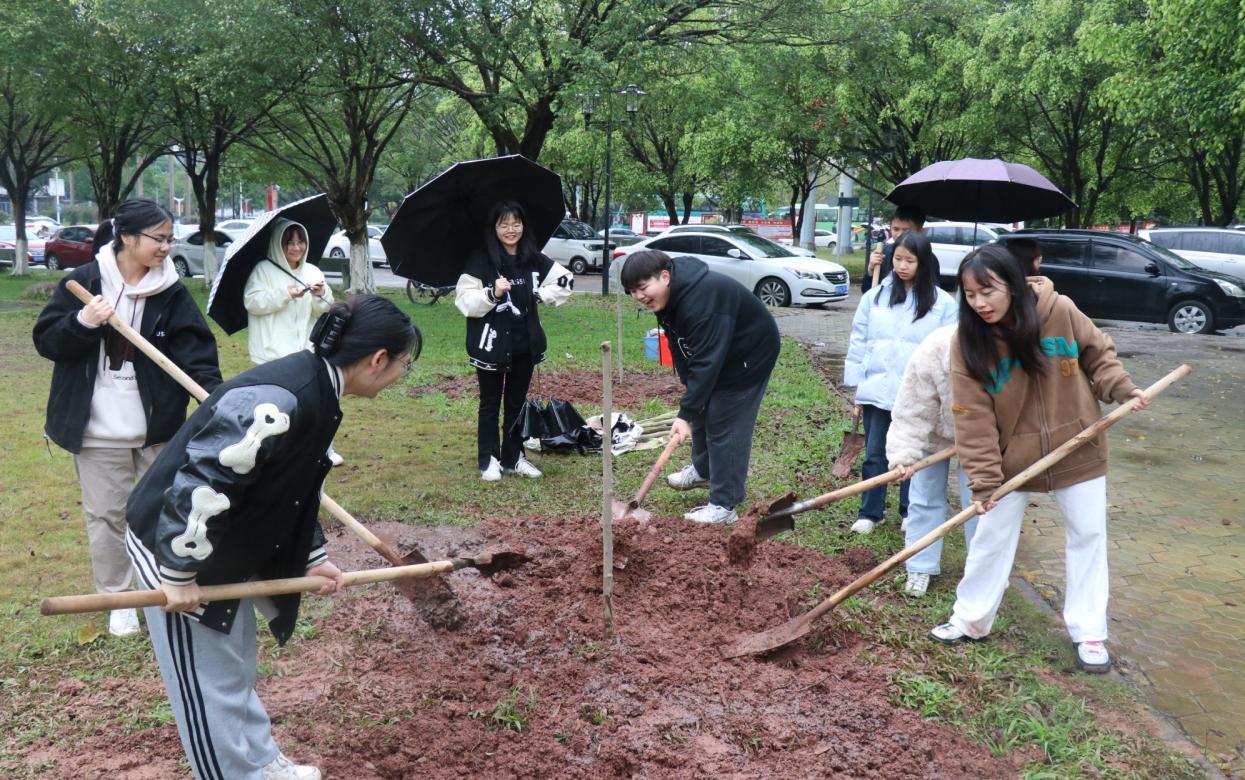 活动开始时,现场仍下着小雨,虽然草地湿滑泥泞,但丝毫没有影响师生植树的热情。领导教师们身体力行,亲自上阵扛起铁锹运泥、铲土,学生则分布在其他土坑旁边,相互协作,挥锹搬运泥浆和土壤。在师生的共同努力下,挖坑、填土、植树、覆土、固定等步骤很快完成。