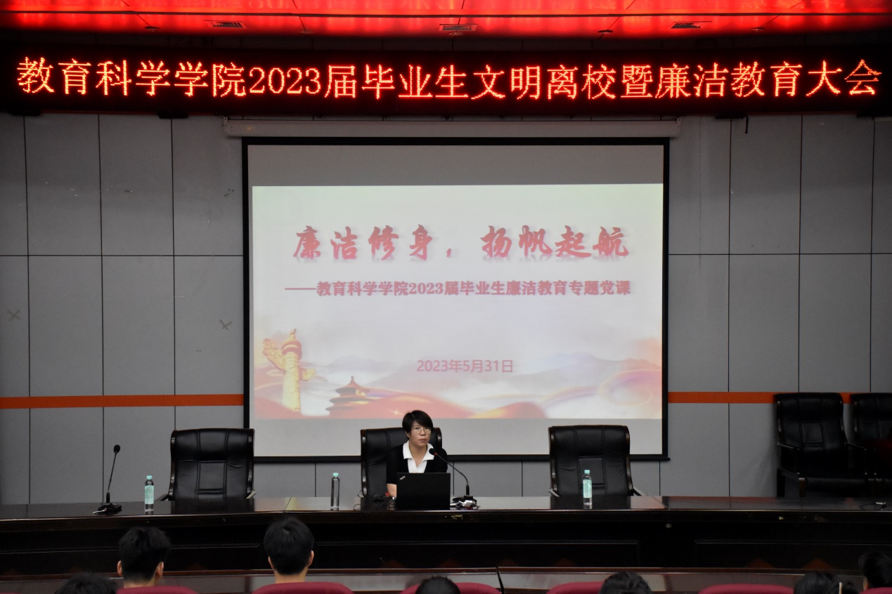 为扎实推进主题教育,进一步加强大学生廉洁教育,教育科学学院分别于5月31日、6月5日在东、西校区学术报告厅召开2023届毕业生廉洁教育专题党课,本次党课由该院党委副书记、纪委书记李尚芳主讲,全体毕业生参加。
