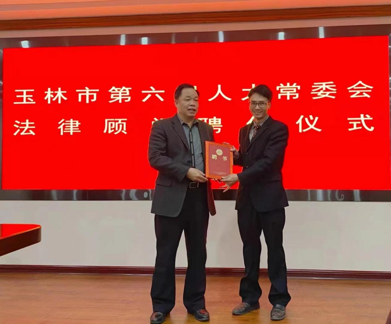 近五年,他分别为玉林市、贵港市起草、论证了《玉林市南流江流域水环境保护条例》《玉林市古村落保护条例》等10余部地方性法规。其中2019年参加的立法论证5次,2020年参加的立法论证4次。2021年参加立法论证3次。2022年参加立法专家咨询论证2次。2022年为玉林市司法局提供法律咨询意见3次。2023年为中共玉林市委、玉林市人大常委会、玉林市人民政府、博白县人民政府提供法律咨询意见10余件。提出的关于玉林市房地产领域涉稳问题及对策研究的决策咨询报告先后获得了玉林市委政法委韦绍仕书记(时任)、玉林市人民政府祝小东副市长(时任)、刘胜友副市长(时任)、丘德奎常务副市长(时任)、韦韬市长(时任)的肯定批示,取得了很好的社会效益。